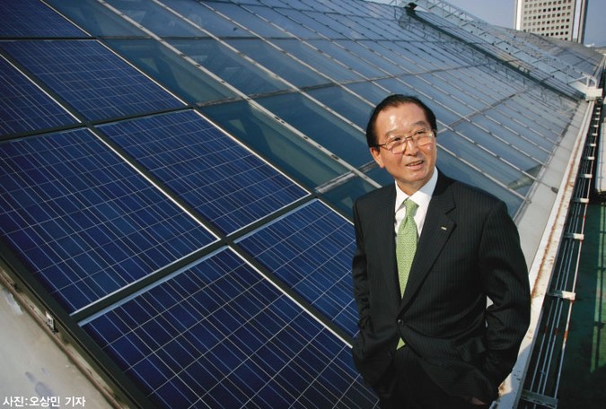 태양광 발전 설비를 배경으로 포즈를 취한 배병관 대표는 지속성을 갖고서 친환경 경영을 밀고 나가야만, 또 친환경 경영이 전 직원의 습관이 되어야만 큰 효과를 거둘 수 있다고 말한다.