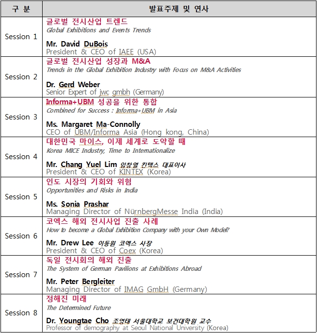 올해는 ‘Opportunities Beyond Borders'라는 주제로 더 빠르게 변화하는 환경 및 글로벌 시장에서 미래에 더 많은 사업 기회 포착을 위해 미국전시협회(IAEE : International Association of Exhibitions and Events) 데이비드 두부와(David DuBois) 대표, 세계 최대 전시주최사인 Informa의 마거릿 마 코널리(Margaret Ma Connolly) 아시아 대표, 독일 뮌헨메쎄 자회사인 IMAG사 피터 버글리더(Peter Bergleiter) 대표 등 업계 최고 전문가들이 전시컨벤션산업의 가치 제고와 지속적인 확대 전략에 대해 통찰 및 조언을 제공할 것입니다.