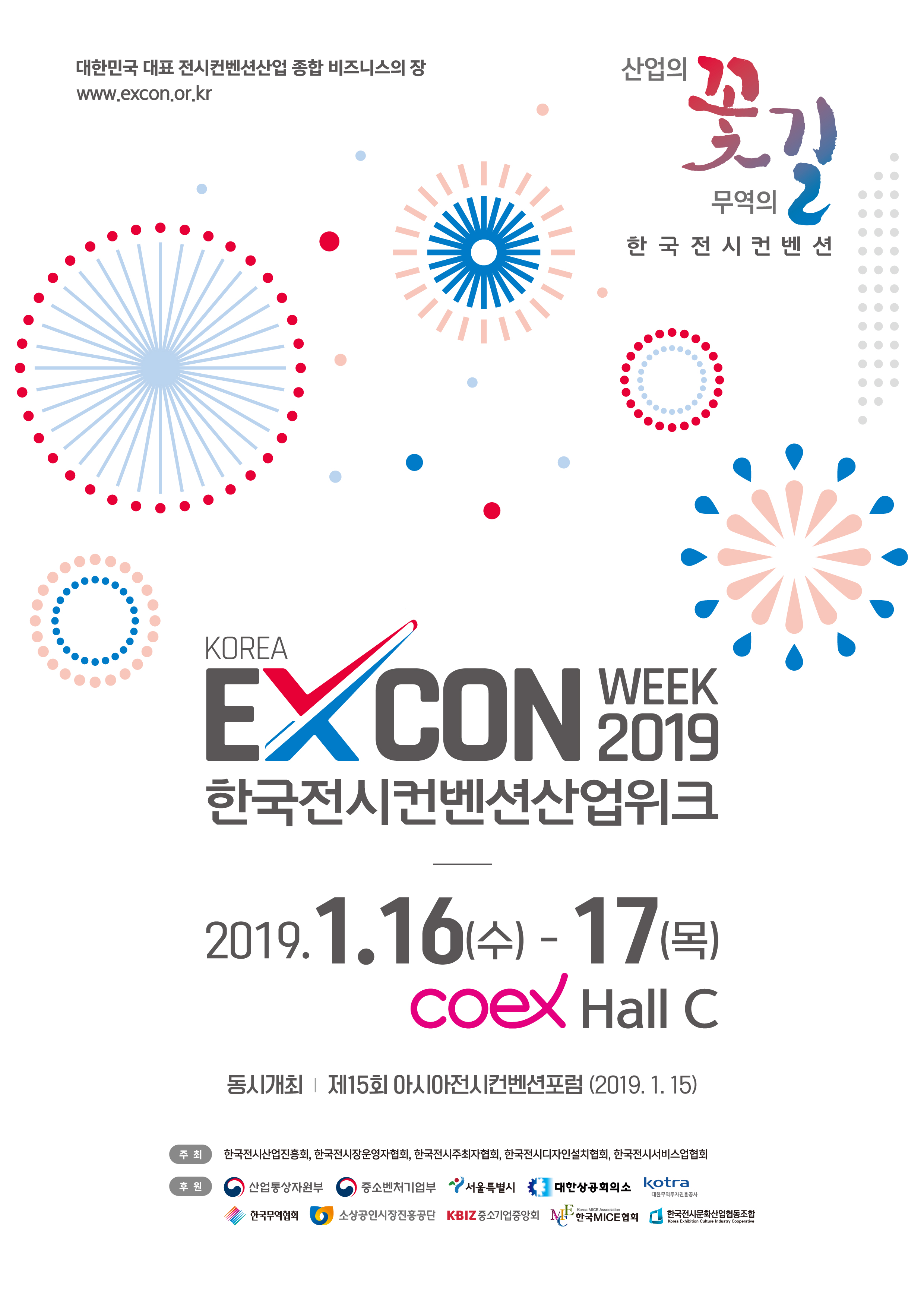 본 회에서 주최하는 ‘2019 한국전시컨벤션산업위크(KOREA EXCON WEEK 2019)’가 2019년 1월 16일(수)-17일(목), 2일간 서울 코엑스에서 개최됩니다.