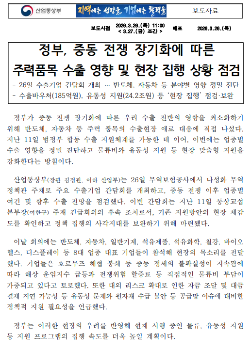 - 032627조간무역정책과, 정부, 중동 전쟁 장기화에 따른 주력품목 수출 영향 및 현장 집행 상황 점검.pdf (246.6K) 0회 다운로드 | DATE : 2026-03-27 09:34:19