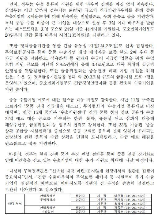| 제목 | 정부, 중동 전쟁 장기화에 따른 주력품목 수출 영향 및 현장 집행 상황 점검 |