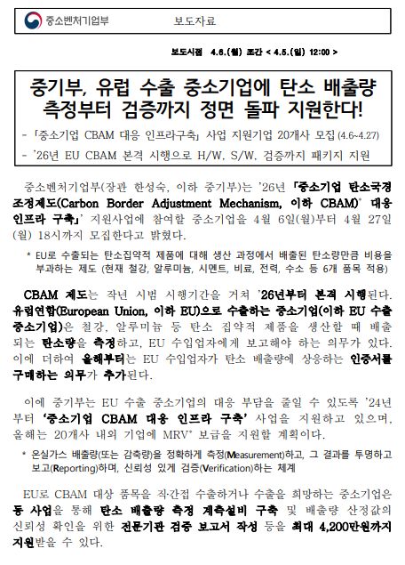- 260406_중기부,_유럽_수출_중소기업에_탄소_배출량,_측정부터_검증까지_정면_돌파_지원한다.pdf (290.3K) 0회 다운로드 | DATE : 2026-04-06 09:59:22
