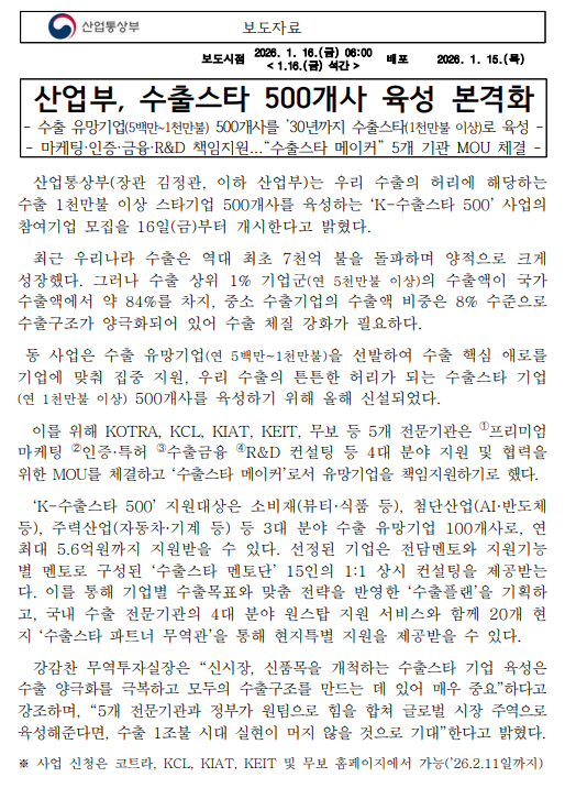 - 011516석간무역진흥과, 산업부, 수출스타 500개사 육성 본격화.pdf (335.5K) 1회 다운로드 | DATE : 2026-01-16 11:17:52