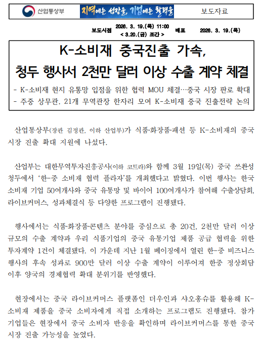 - 031920조간무역정책과, K-소비재 중국진출 가속, 청두 행사서 2천만 달러 이상 수출 계약 체결.pdf (235.2K) 0회 다운로드 | DATE : 2026-03-20 10:52:11