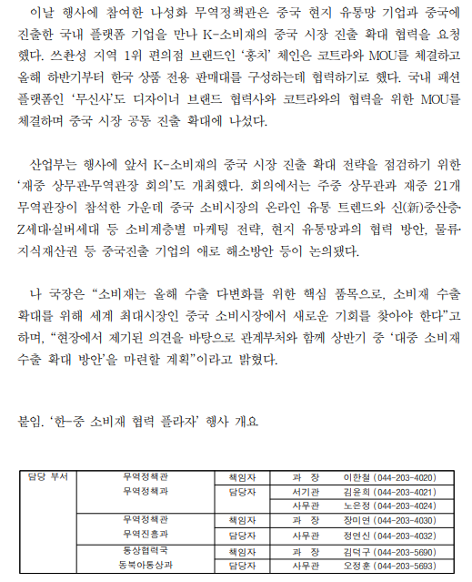 | 제목 | K-소비재 중국진출 가속, 청두 행사서 2천만 달러 이상 수출 계약 체결 |