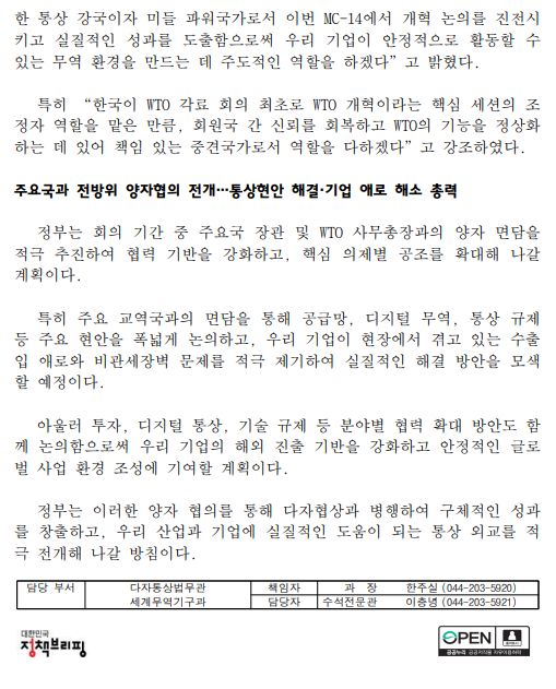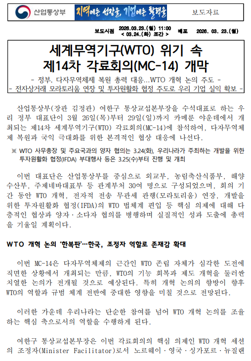 세계무역기구(WTO) 위기 속 제14차 각료회의(MC-14) 개막