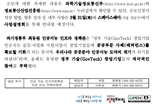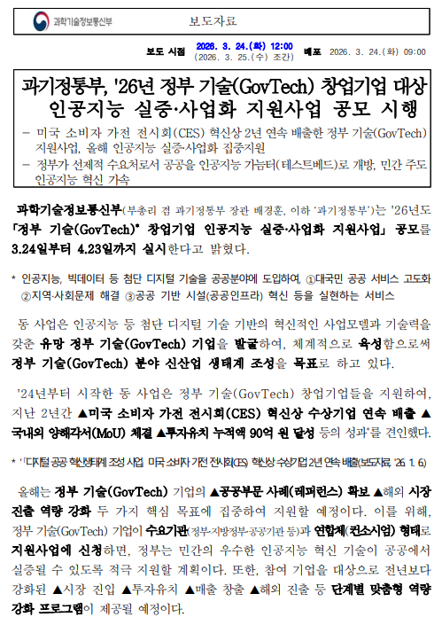 - 260325 조간 보도 과기정통부, 26년 GovTech 창업기업 대상 AI 실증·사업화 지원사업 공모 실시최종.pdf (242.7K) 0회 다운로드 | DATE : 2026-03-25 09:41:54