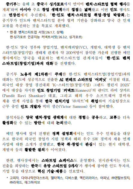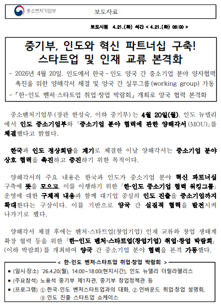 (중기부) 인도와 혁신 파트너십 구축! 스타트업 및 인재 교류 본격화