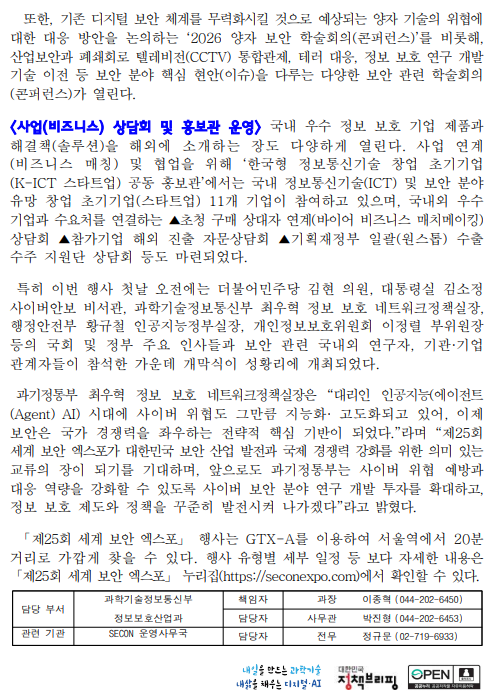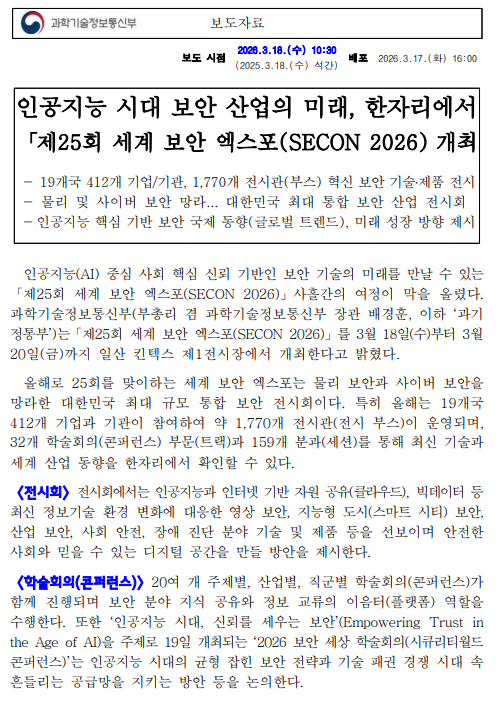 (과기부) 인공지능 시대 보안 산업의 미래, 한자리에서 「제25회 세계 보안 엑스포(SECON 2026) 개최