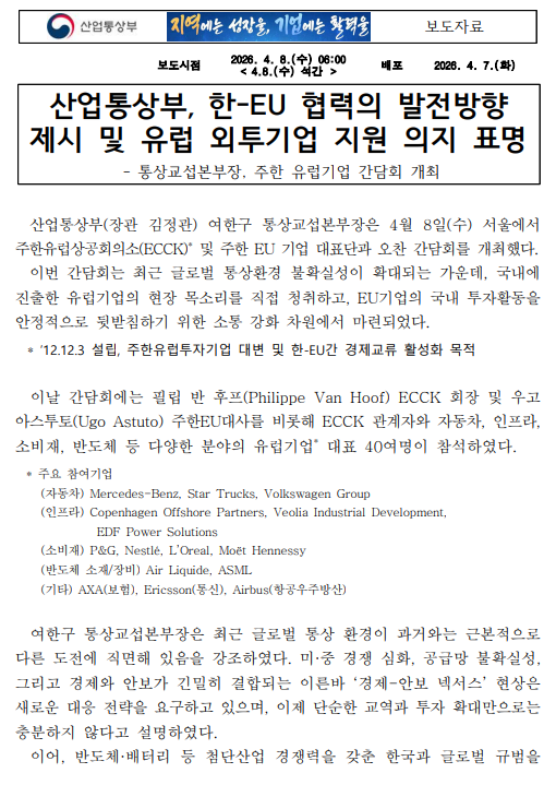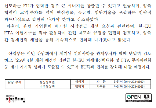 | 제목 | 한-EU 협력의 발전방향 제시 및 유럽 외투기업 지원 의지 표명 |