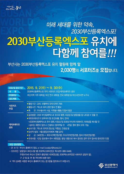 제목 | [안내] 2030 부산등록엑스포 유치를 위한 서포터즈 모집 안내 |